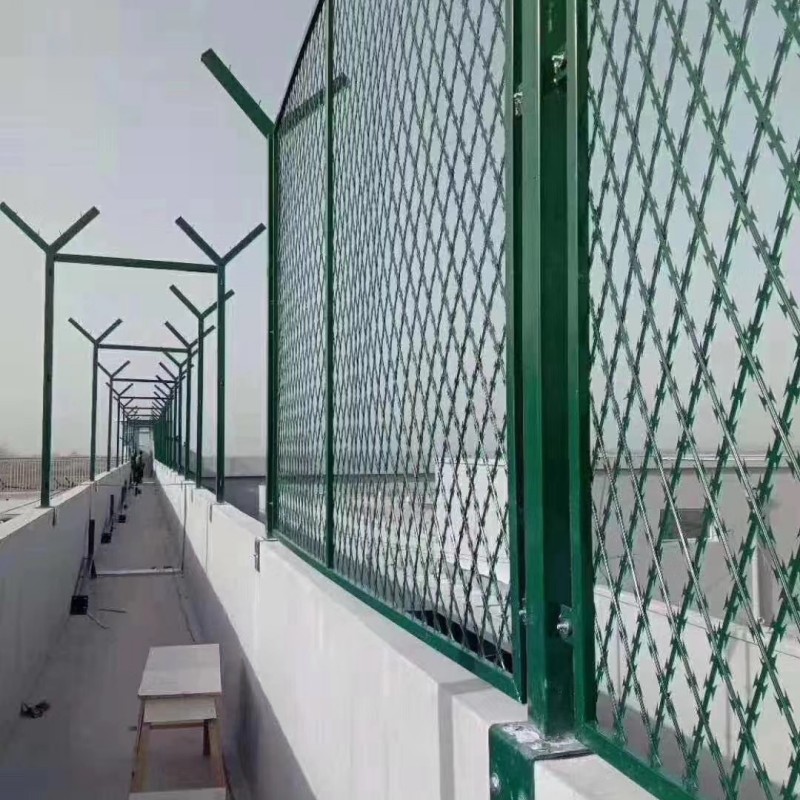 高度總體高度一般為:3米--4米高,立柱跨度間距為3米,邊框為20X30方管,也有使用30X30或者30X50的方管,網孔為:70X150mm、50X100、60X120等,絲徑為:4mm-6mm,立柱規格為:60X60、80X80、100X100方柱,V字高度為:50cm,立柱壁厚:2mm-3.5mm,法蘭盤規格為:200X200X10mm,整體全部采用鍍鋅材質浸塑或者靜電噴涂。連接方式網片邊框打孔。立柱焊接邊耳用螺絲連接。頂部加焊大V字型網片,用來支撐蛇腹型刀刺網,蛇腹型刀刺網材質為熱鍍鋅或不銹鋼,使用壽命長,這樣組裝起來的監獄隔離網堅不可摧。