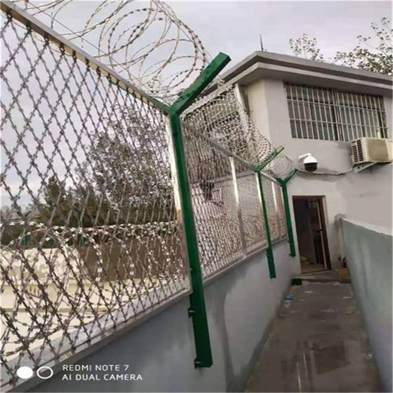 監獄圍墻刺網是經過采用刀刺網來焊接形成的一種圍墻刺網,也可稱為監獄焊接刀片刺網、監獄刀刺滾籠、看守所刀片刺網等;焊接直線型刀片刺網,是把刀片刺絲焊接成菱形孔或者方形孔的刺網,如果有人想攀爬翻越,網狀的刀片刺絲刀片鋒利,手不能握,腳不能攀登,堅決阻止人逾越的防護墻,具有很強的恐嚇和阻止效果,既美觀又實際效果顯著。焊接的刀片刺絲,深受監獄、軍事、保密組織的使用。焊接的刀片刺網和蛇腹網結合使用,使人望而卻步,擊破人的僥幸心理.