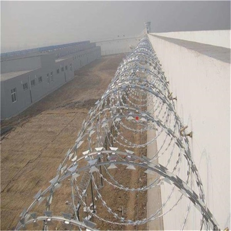 按材質來分貴的就是304不銹鋼刀刺網,其次是不銹鐵刀刺網,再就是熱鍍鋅刀刺網。刺刀圈安裝一般采用角鐵來加以固定,根據刺刀圈的圈徑來決定角鐵的高度,一般情況是每隔3米一個支撐角鐵,直接插入圍墻里面,然后加以固定,再把刀刺網安裝上去,在中間拉上3-4根鐵絲,卡子固定上即可。V型支撐是用方管、圓管或者角鐵焊接而成的,整體的結構采用三角穩定原理,支架兩個頂端和最下端都會預先打好孔,方便安裝的時候穿鐵絲固定刺繩的。