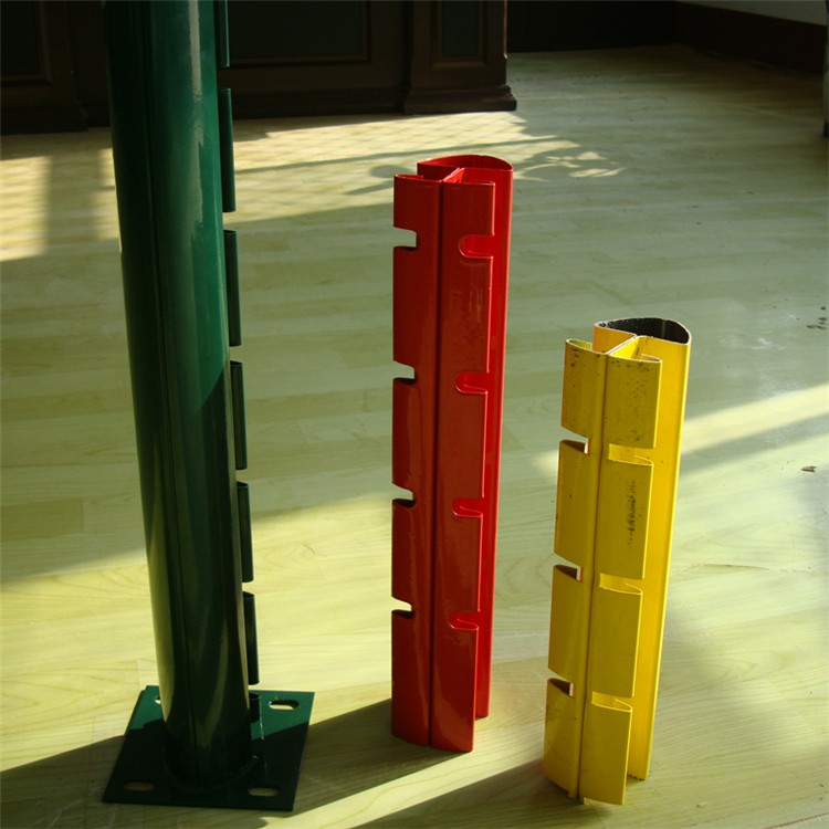 桃形柱圍欄的柱子的厚度為1-1.2毫米,由機(jī)器冷壓彎曲而成。圓柱體的外側(cè)是橢圓形的。內(nèi)側(cè)的兩塊板連接后,網(wǎng)格向外彎成U形,即為鉤部。為了便于桃形柱與網(wǎng)格的連接,根據(jù)柱內(nèi)網(wǎng)格的網(wǎng)格大小,沿柱的長(zhǎng)度均勻設(shè)置N組鉤狀缺口,分布在柱的兩側(cè)。U型掛鉤的外部為橢圓形,與立柱的直邊相切,有效防止撬起,保證護(hù)欄防撬的安全性能。