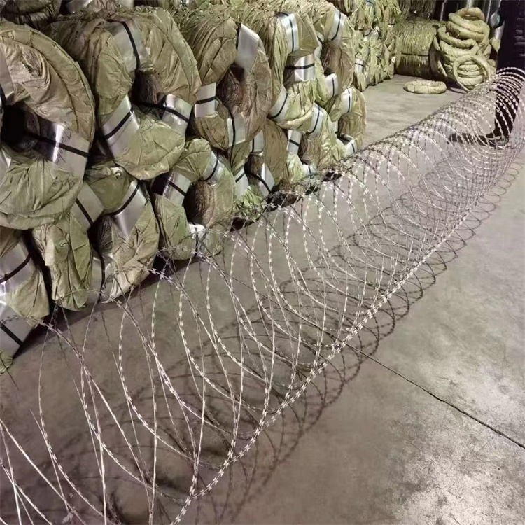 刀片刺網由熱鍍鋅鋼板或不銹鋼薄板沖壓出尖銳的刀片狀,高張力鍍鋅鋼絲或者不銹鋼絲做芯線組合而成的阻絕器材。由于刺網造形 不易觸摸,因而能達到 的防護隔離效果。產品的主要材質有鍍鋅板和不銹鋼板。平時我們常見的,和常使用的就是鍍鋅和不銹鋼當然顏色會比較單一就是呈現銀色,這一款有的時候跟我們的環境不太搭配,今天給介紹一款還能噴塑對的刀刺繩,呈現出綠色。更能美化環境。