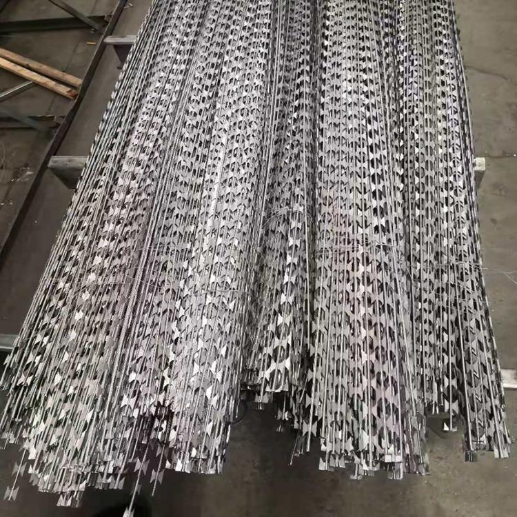 刀型刺絲又稱刀刺網是一種近年發展起來的防護、隔離能力較強的新型防護網產品。刀刺網它采用鋼板沖壓成型包附于熱鍍鋅鋼絲(筋絲)之上,由銳利尖角鍍鋅鋼板或不銹鋼薄板做刀片,高張力鋼絲做芯線組合而成的。鋒利的刀型刺由雙線扣裝后成蛇腹狀,既美觀又讓人不寒而栗。起到了很好的阻嚇作用。邊境鐵絲網以刺絲滾籠采用刀片刺繩繞圈后相臨兩圈每隔120°用刺絲連接卡固定,張開后形成蛇腹網狀,閉合后刀片刺繩圈徑為50cm,邊界刺鐵絲網價格,張開后每交叉安裝間距20cm,直徑不小于45cm交貨時,刺絲滾網(籠)成品應為按此條要求用刺絲連接卡固定好的成籠。刀片刺繩由沖切鋼板采用機械壓;普通鐵絲(上鋅量200g)絲徑為12號熱鍍鋅鐵絲,花為14號熱鍍鋅鐵絲,花為四,花間距8-10cm,長1.7-2cm,每個花距4個扭股,鐵絲截面每平方米鍍鋅量在200g以上,每卷刺鐵絲重量25±1kg,其他參照GB/T343-94,GB/T15393-94標準執行。特殊型刺鐵絲經線為13號高碳熱鍍鋅鋼絲,絲徑2.5mm,片厚度0.5mm,長度22mm,間34mm,刺高度9.8mm,鍍鋅含量在200克/平方米以。
