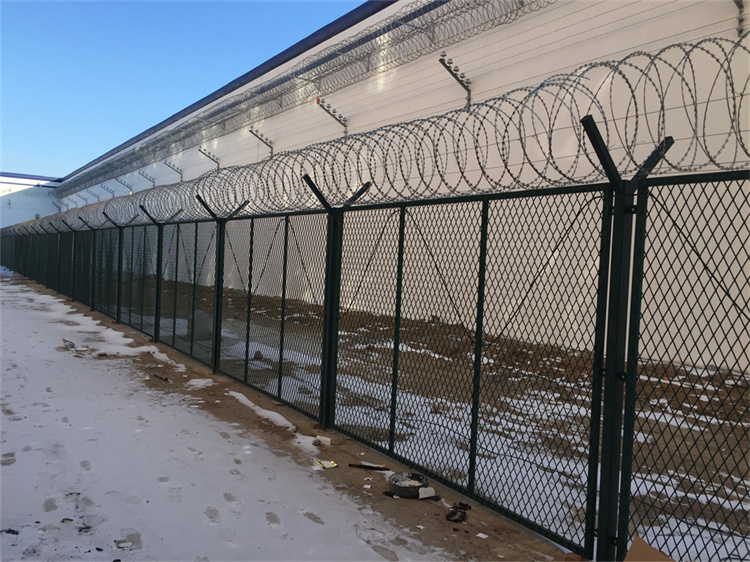 看守所隔離網高度總體高度一般為:2.5米--4米高,立柱跨度間距為3米,邊框為20X30方管,也有使用30X30或者30X50的方管網孔為:70X150mm、50X100、60X120等,絲徑為:4mm-6mm,立柱規格為:60X60、80X80、100X100方柱,V字高度為:50cm,立柱壁厚:2mm-3.5mm,法蘭盤規格為:200X200X10mm,整體全部采用鍍鋅材質浸塑或者靜電噴涂。連接方式網片邊框打孔。立柱焊接邊耳用螺絲連接。頂部加焊大V字型網片,用來支撐蛇腹型刀刺網,蛇腹型刀刺網材質為熱鍍鋅或不銹鋼,使用壽命長,這樣組裝起來的監獄隔離網堅不可。
