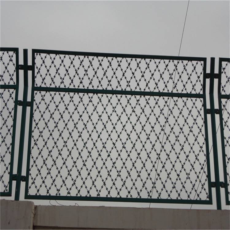 菱形焊接刀片刺網刀片刺網中間焊接的刀片刺網和蛇腹網結合使用,使人望而卻步,擊破人的僥幸心理。