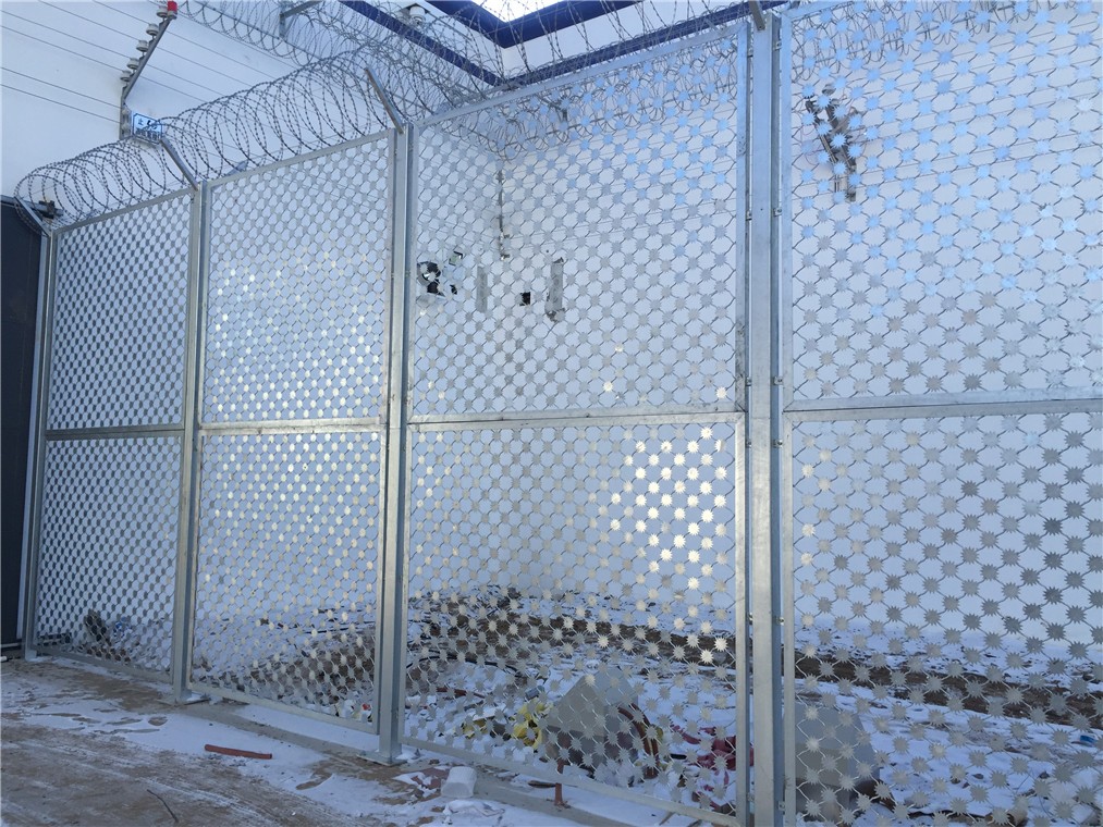 將梅花刺片隔離網按照事先測量好的數據,對號安裝,確保安裝無誤。網片的安裝孔對準立柱的連接板,然后用不銹鋼螺栓依次穿過網片連接板、立柱連接板,將防盜帽套在螺栓上,用螺母鎖緊,按照前面的步驟,依次將其他連接板固定。安裝完梅花刺片隔離網網片以后檢査是否有螺絲松動,施工時表面的破損,及時刷防銹漆,以防止生銹。檢查立桿是否有松動現象,如有,需及時處理。最后將不銹鋼拉絲固定在隔離網的頂部,形成一個v型托網用于架設蛇腹形刀刺網,將刀刺網按照12cm的間距均勻鋪設在v型支架上,用不銹鋼防拆卸卡扣與v型托網上的不銹鋼拉絲固定。在安裝完成后,對梅花刺片隔離網的防鐢爬性能,進行跨越、防破壞測試。待以上工作完成以后,通知業主進行驗收。