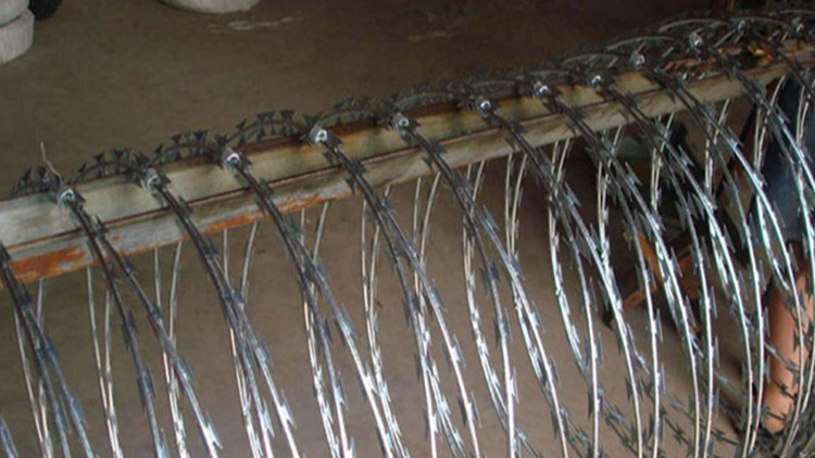 (5)安裝好支架立柱了,先把要安裝刀片刺繩的拉絲給固定上,然后利用拉絲的支撐力來(lái)安裝刀片刺繩,并用專用的卡扣、卡鉗進(jìn)行固定。