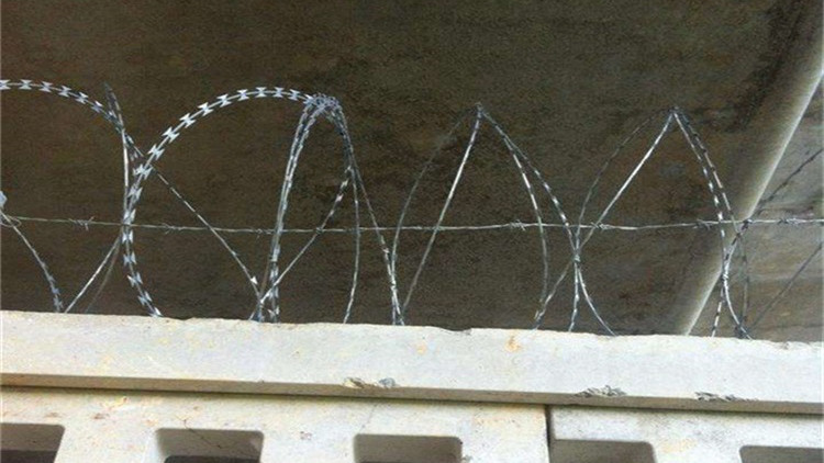 (4)支架在圍墻上的固定方法一般為底盤(pán)打膨脹螺絲固定。固定好后,方可進(jìn)行蛇腹形刀刺網(wǎng)安裝。