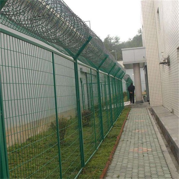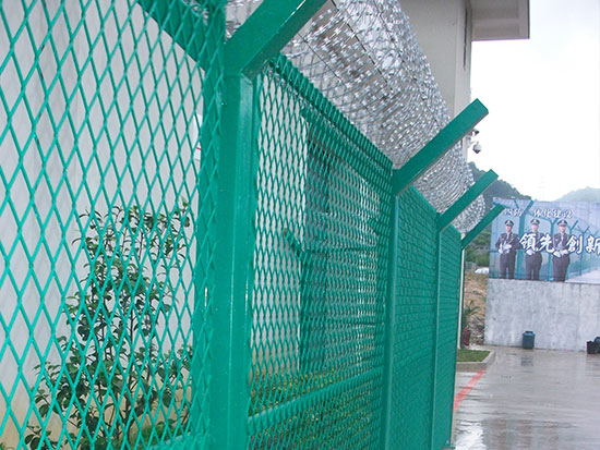 看守所焊接鋼網墻的安裝位置是建于看守所監區的內外墻地面及高墻之上,網墻內側或頂部加裝蛇腹形刀刺網產品,具有結構新穎、堅固緊密、網面平整、網孔均勻、刀鋒銳利、防攀爬、耐腐蝕性強等特點,形成一道高不可攀、難以逾越的隔離障礙。配合高壓打擊電網各種監控報警設備確保看守所監區安全萬無一失。