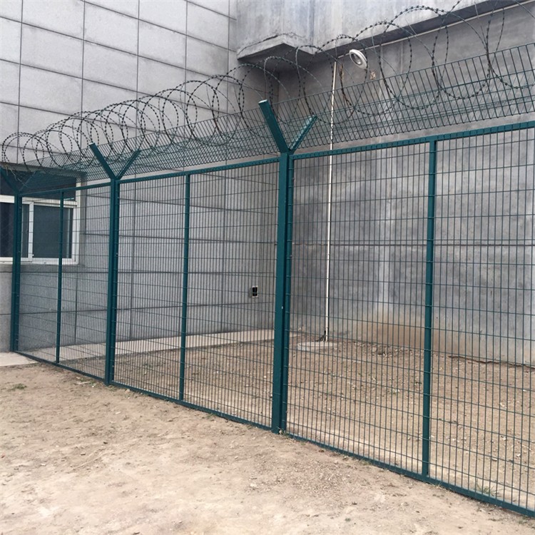 近年來,被廣泛應用在看守所,軍事基地等高安全場所。注;如果在看守所鋼網墻頂部加裝刀片刺絲、刀片刺繩后又很好的地增強了安全防護性能。采用電鍍、熱鍍、噴塑、浸塑等防腐形式。其產品造型美觀、花色多樣,既起到圍欄作用,又起到美化作用。看守所鋼網墻由于具有安全性高、防攀爬能力好,網片連接方式采用特制SBS緊扣件,有效防止人為的破壞性拆卸橫向四道折彎加強筋,使網面強度顯著增加。