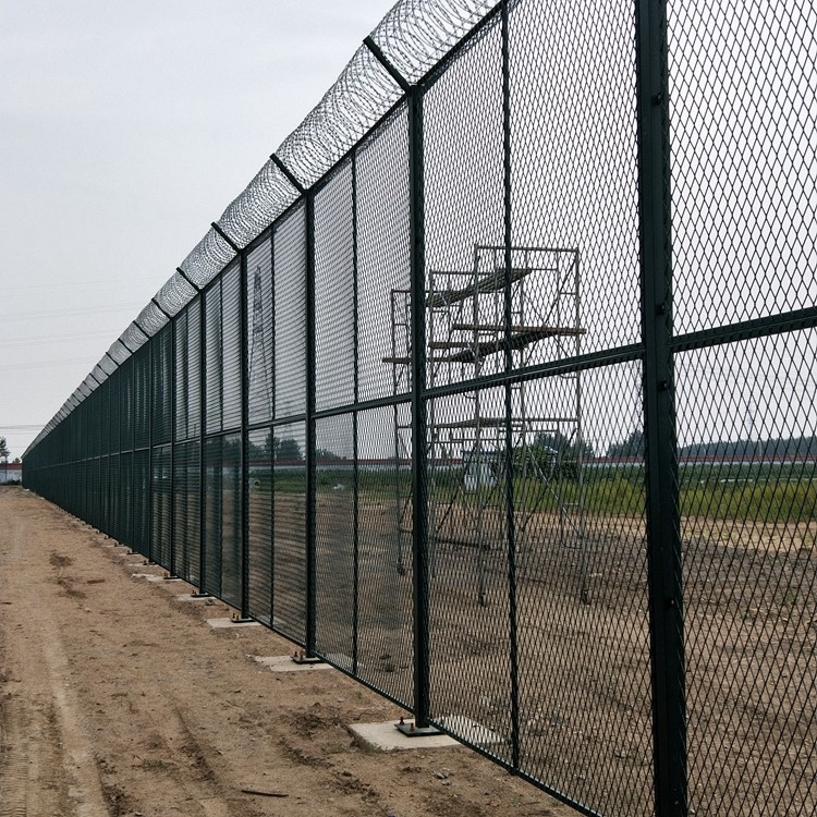 機場圍界網采用優質低碳鋼絲。規格:采用5.0mm高強度低碳鋼絲焊接。刀片鋼網墻網孔:50mm*100mm,75mm*150mm(菱形孔);立柱為60X60的矩形鋼,頂端焊有V型之架,或者采用70mmX100mm的掛式連接立柱。產品均為熱鍍鋅后采用高質量的聚酯粉末靜電噴涂,采用國際流行的RAL顏色。