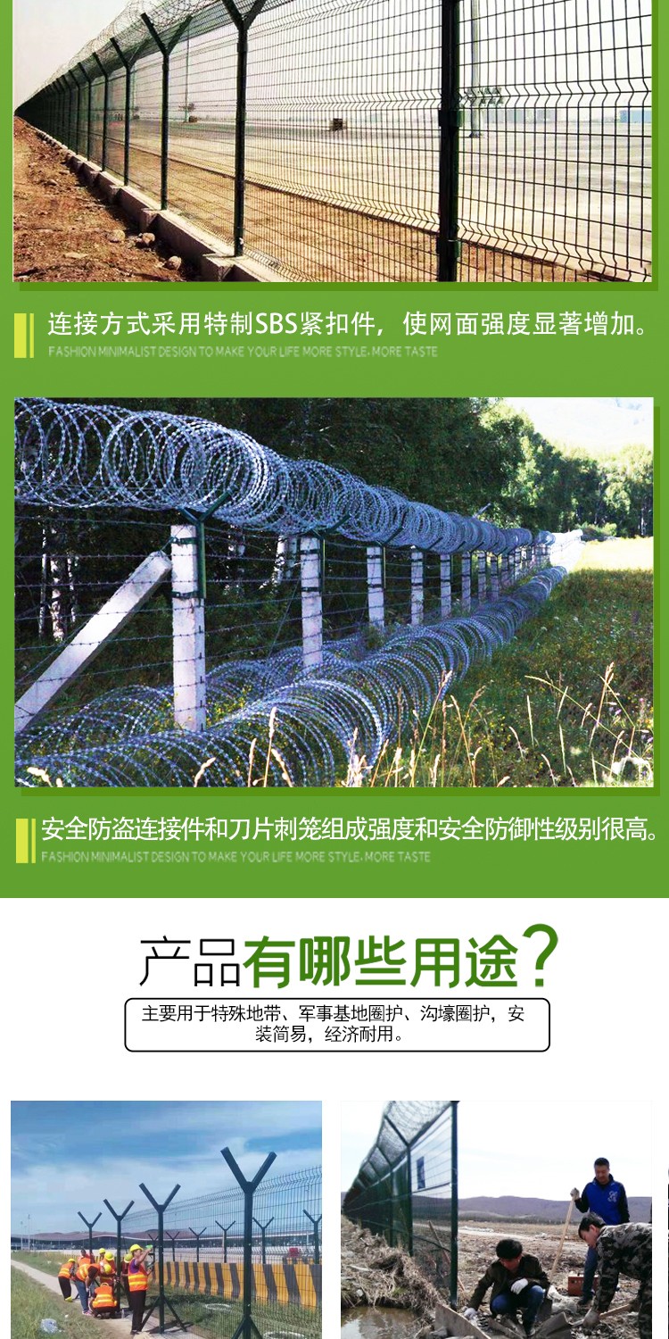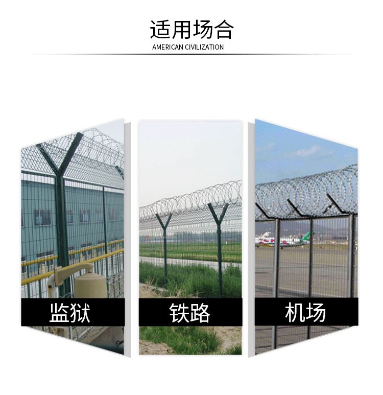 在頂部的V型網(wǎng)可以做網(wǎng)片安裝刀刺網(wǎng)也可以替換成拉絲,安裝簡(jiǎn)便快捷,同時(shí)能夠節(jié)約成本。立柱頂部的V型支架兩個(gè)側(cè)臂焊接有專用的刺網(wǎng)鉤,每一側(cè)架2道鋼絲,形成一個(gè)V型槽,然后把刀刺網(wǎng)架到上面,并根據(jù)要求的拉伸間距拉開(kāi),再用專門(mén)的不銹鋼卡扣把鋼絲和刀刺網(wǎng)卡在一起,可以選擇500mm600mm圈徑的,這樣就完成了整個(gè)監(jiān)獄隔離網(wǎng)的安裝。在監(jiān)獄隔離網(wǎng)的上部安裝了帶刀刺網(wǎng)后,會(huì)使監(jiān)獄隔鐵絲護(hù)欄網(wǎng)的安全防護(hù)性能得到極大的增強(qiáng),監(jiān)獄鐵絲護(hù)欄網(wǎng)采用熱鍍,噴涂,浸涂等防腐形式,因此具有優(yōu)良的抗老化,防曬,耐候性等特點(diǎn)。