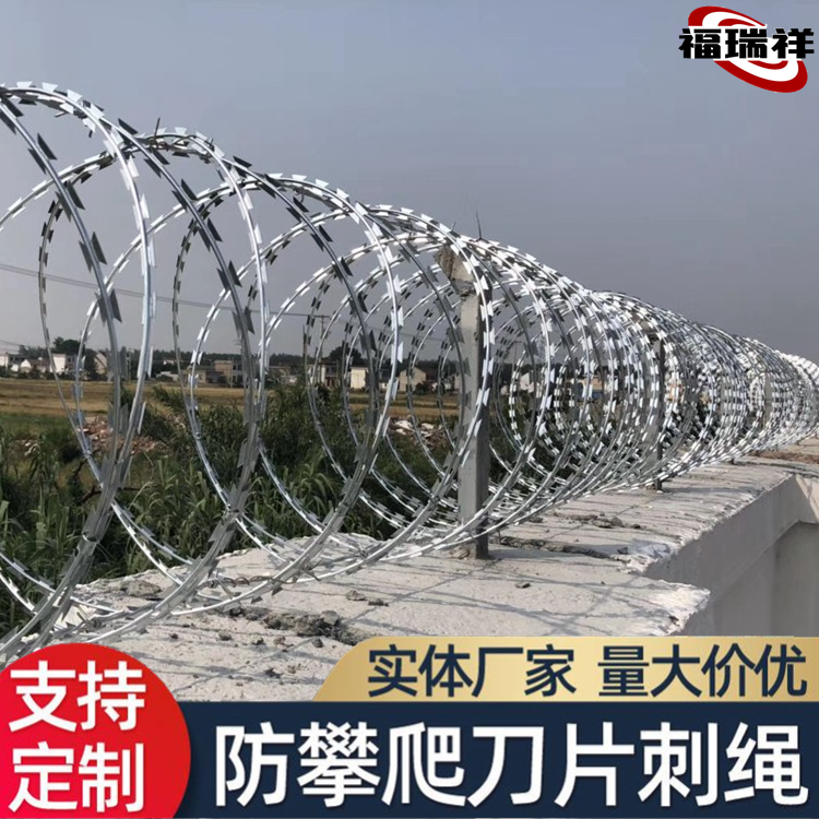刀片刺是帶到刀片形狀的一種網(wǎng),可以在墻面直接安裝,也可以在柵欄上安裝,主要起到防護防盜防賊的作用,形狀像是一條盤踞的大蛇,每圈的刀刺間距是34mm,刀刺長22mm,刀刺特別鋒利,圈徑可分為300mm,500mm,600mm,900mm只要觸摸都會被刺傷,是現(xiàn)在小區(qū)、監(jiān)獄、家用、機場,軍事基地,鐵路等需要隔離防護場所必備的一款鋼絲網(wǎng)。