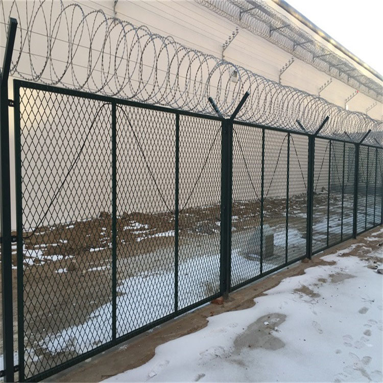 監獄鋼網墻款式-梅花刺鋼網墻作用總體的有,普通監獄鋼網墻,太陽花刺鋼網墻,菱形焊接刀片刺網,螺旋式刀片刺鋼網墻,鍍鋅358監獄防攀爬鋼網墻等等,但總得來說,要有大于5.0mm粗的絲徑,或者是刀刺網焊接,另外立柱不得少于2.0mm壁厚,直徑不低于60*60mm,頂部加裝V型架,在頂部V型架上裝有刀刺網;而對于太陽花刺鋼網墻來說,在網片的絲和絲的交叉處,焊接類似太陽花的刀片,起到防攀爬的作用。